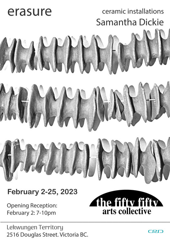 In my ceramic art practise, I use abstraction, minimalism and multiplicity to create large-scale sculptures, and multi-component installations. This exhibition draws on research in anti-colonial, anti-capitalist feminist scholarship for creative inquiry about Erasure: the act of causing a feeling, memory, or period of time to be completely forgotten. In this project, I use abstraction to contemplate and unsettle the nature of erasure, both personally and societally: the impact of historical and current omission, eradication, deletion, devaluation, obliteration; and the collective responsibility to remember, to learn, to assert. The installations in the exhibition are interactive, inviting the viewer to move components; to walk around, under and through; to sit, wonder, respond, and co-create.