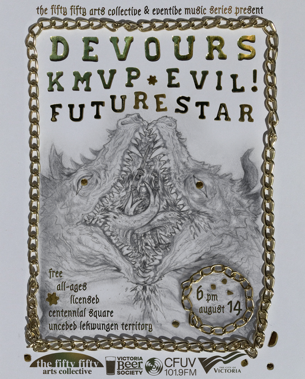 Eventide Music Series and the fifty fifty arts collective bring in Vancouver's Devours and Future Star, Nanaimo's KMVP and locals Evil! for a free all ages outdoor concert in Centennial Square! Featuring a diverse lineup of rock, experimental and electronic acts. On site will be a beer truck from Victoria Beer Society, non alcoholic drinks by Free Beer*, and Filipino street food by Big Bad Bob's food truck!