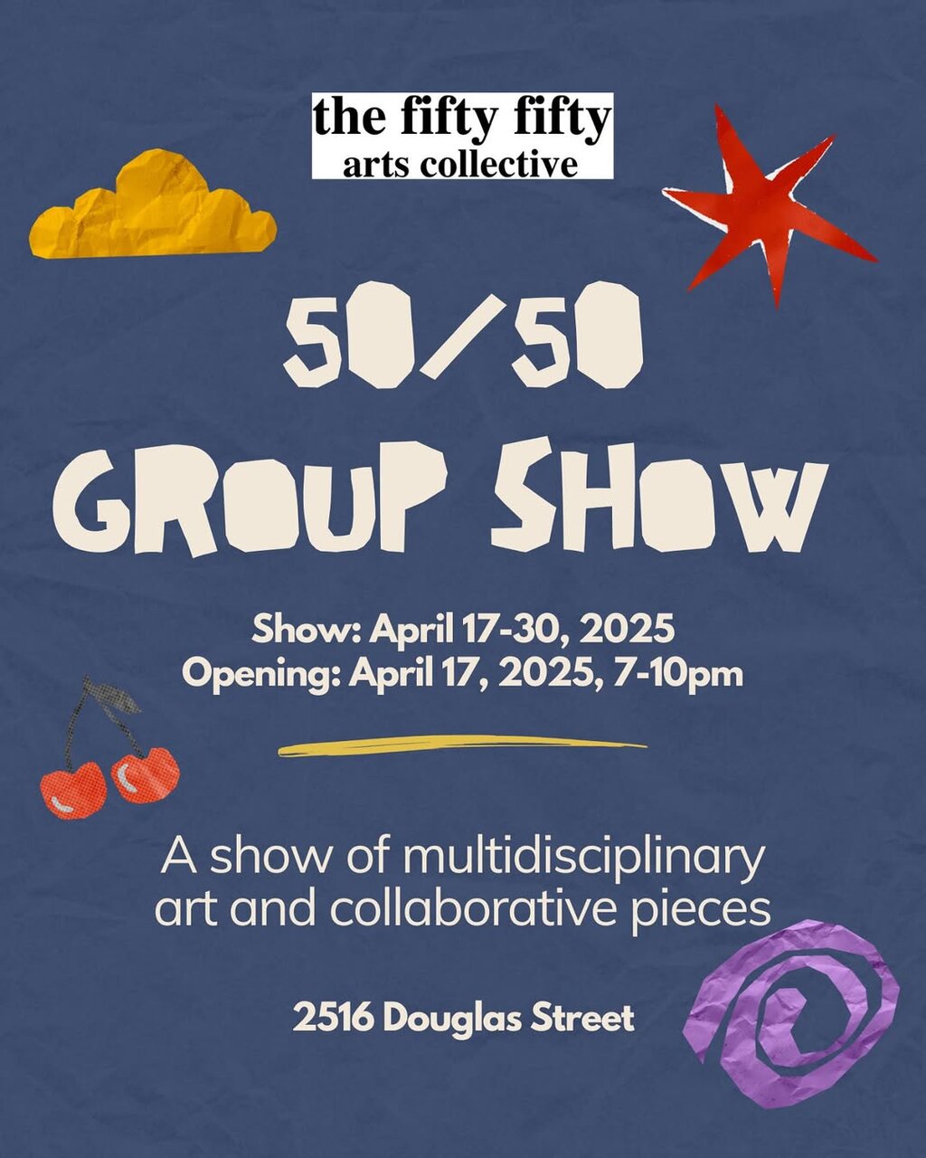 << back to archives Thu. April 17th 2025 - Wed. April 30th 2025 @ the fifty fifty arts collective Free (All Ages) Tuesday 12-2pm (except April 22) Thursday 11am-1pm Friday 11am-1pm Saturday 11am-1pmAn open group show featuring local artists! Apr. 17, 2025 @ the fifty fifty arts collective Apr. 17, 2025 @ the fifty fifty arts collective Apr. 17, 2025 @ the fifty fifty arts collective Apr. 17, 2025 @ the fifty fifty arts collective