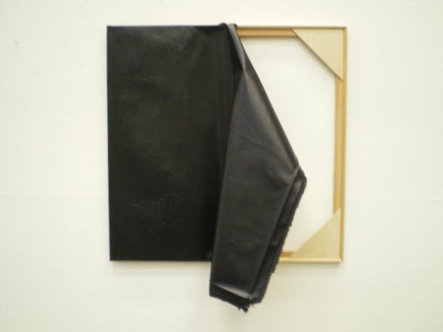 What constitutes a painting? Where does the frame start or stop witheach object, but also within the physical space of the gallery. Also,what makes a painting a painting and does the frame establish a setperimeter? Using black as a way to negate away from the aeseticproperties of color to the viewer. The frame is brought into questionas each object transforms the notion of what a painting is within atraditional sense.