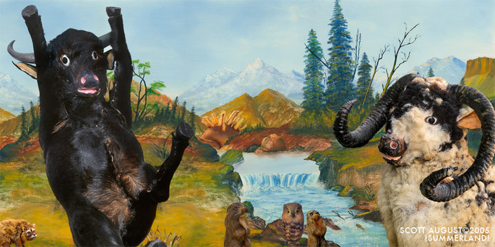 Scott August is a British Columbia based artist whose work often questions the relationship between man and nature. August’s work is primarily made up of montaged photographic images, often using unusual toys, found paintings, taxidermy, and awkward images of himself as the subject matter. By using printed backdrops, costumes, miniatures, and objects from nature, August utilizes digital technology only as a production tool, he ...focuses on creating work that is more timeless and aesthetically traditional then the work of his generation’s many other digital artists.