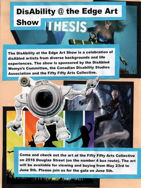 The DisAbility at the Edge Art Show is a celebration of disAbled artists from diverse backgrounds and life experiences. The show is sponsored by the DisAbled Womyn’s Committee, the Canadian Disability Studies Association and the Fifty Fifty Arts Collective.