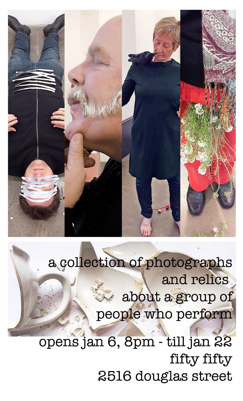 please check fifty fifty facebook page or fifty fifty website for current hours; please feel free to email collective to book viewing outside of gallery hours if necessary A Collection of Photographs and Relics runs from January 6th to Sunday, January 22nd with performances occurring on January 6th during the opening, and on Saturday, January 21st at 3pm.