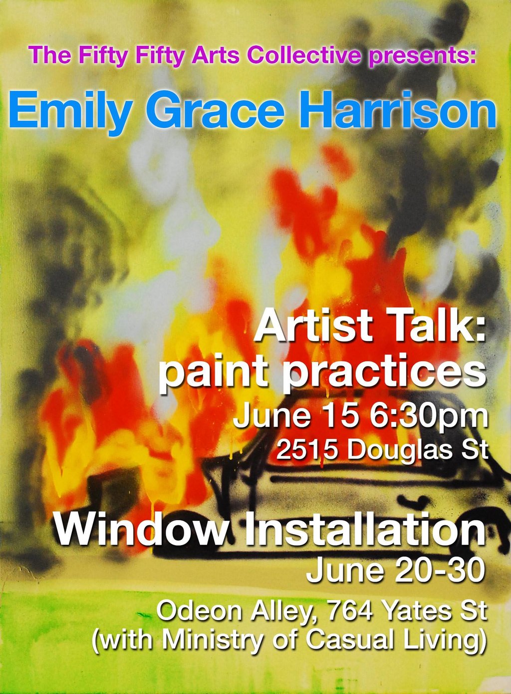 The fifty fifty arts collective, with the support of the Ministry of Casual Living, is programming Bonnie McComb Kreye Artist-in-Residence, Emily Grace Harrison, in the Ministry's Odeon Alley Window from June 20th to June 30th. On Thursday, June 15th at 6 30pm, join the collective and a host of artists and guests for a casual conversation on contemporary paint practices. During the conversation Harrison will have the opportunity to discuss the pieces she has been working on during her residency and what will be shown in the Odeon Alley Window.