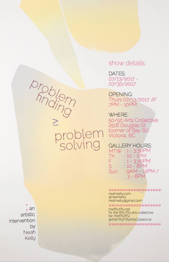 Please see the 50/50's facebook page for a current listing of our operating hours, or contact the collective via email to set up a viewing. Neah Kelly: Problem Finding ≥ Problem Solving
