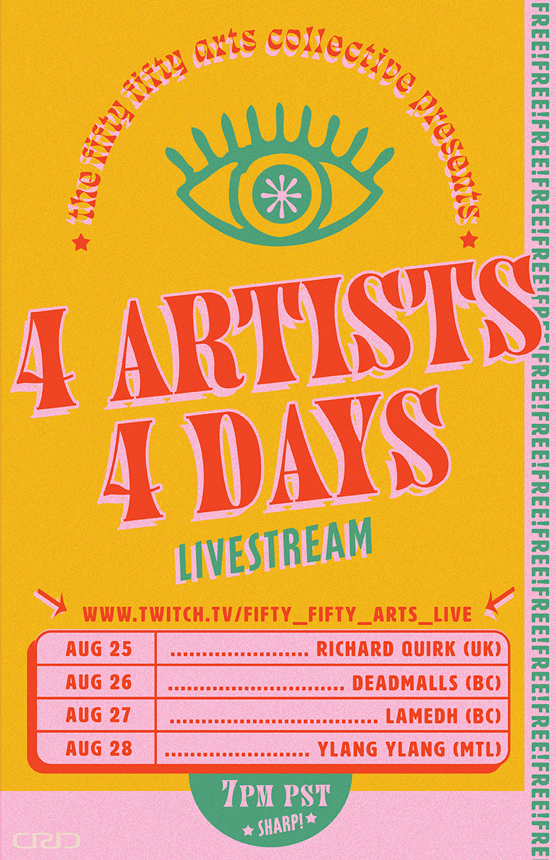 All performances start at 7PM sharp. The performances can also be streamed up to 14 days after this event at this link https://www.twitch.tv/fifty_fifty_arts_live/videos